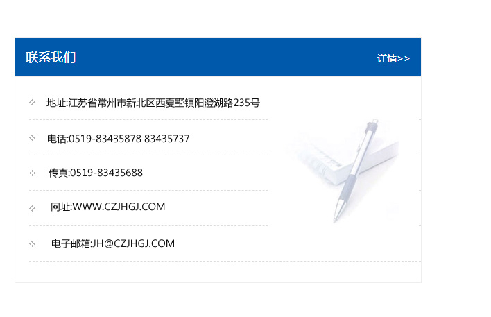 傳真:0519-83435688    郵編:213135    網(wǎng)址:WWW.czjhgj_com.ilinoiart.com    電子郵箱:JH@czjhgj_com.ilinoiart.com
